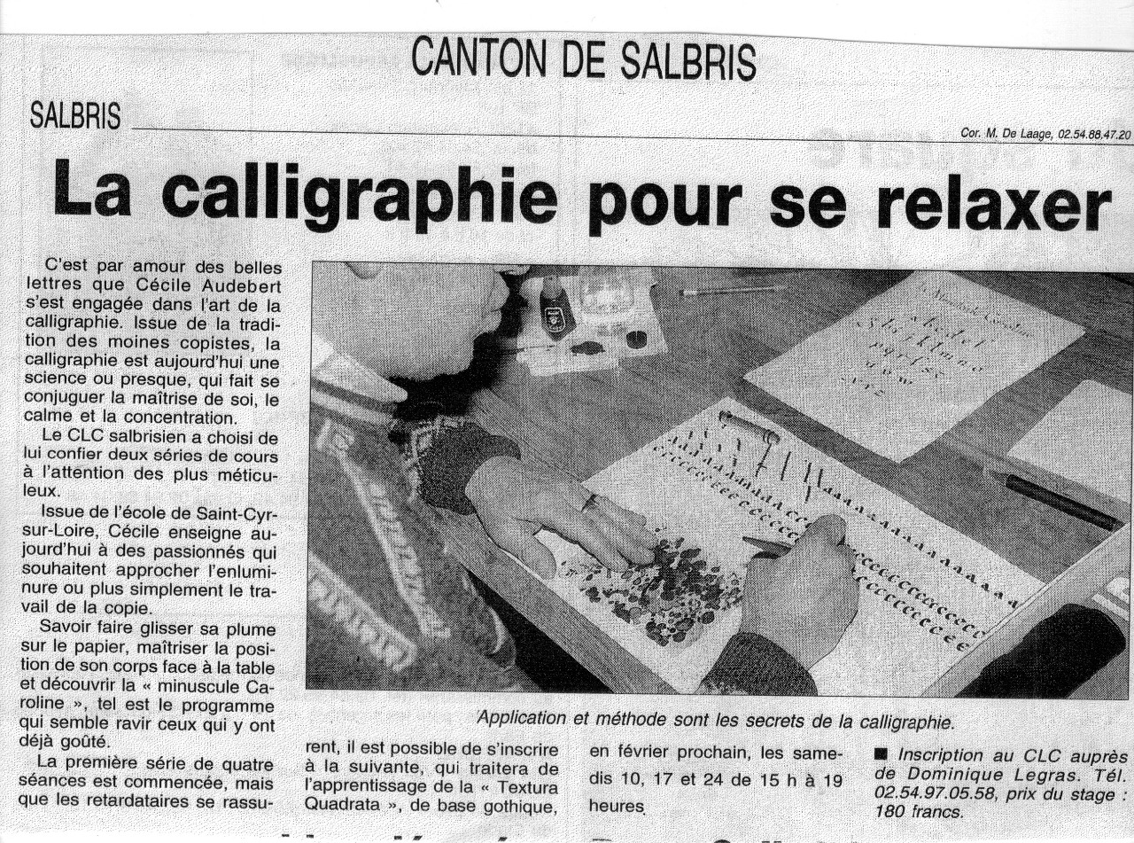 En ce qui me concerne, à la suite d'un reportage visionné sur la chaîne TV "Demain" en 1999 sur la calligraphie et l'enluminure à l'Institut Alcuin de St Cyr s/Loire et en quête d'une reconvertion suite à fusion de l'Entreprise où je travaillais depuis 14 ans, j'ai été séduite par cet Art. Ma fille qui étudiait à Lisa à Paris m'avait déja sensibilisée sur le sujet.